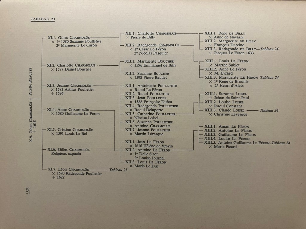 | Génération 2 Gilles Charmolue Génération 3 – Radegonde Charmolue x César le Féron (1738) – Charlotte Charmolue x Pierre de Billy (1638) Génération 4 – René de Billy (1645) – Radegonde de Billy x Jacques le Féron (1645, 1649) – Marguerite de Billy x François Daraine (1645, 1666, 1681, 1691) Génération 5 – Gabriel-François Daraine (1711, 1731) Génération 6 Marie Antoinette Daraine x Augustin Thomas Génération 7 Antoine-Augustin Thomas, seigneur du Fossé (1765), dont les droits appartenaient à Marie Duchesnay x Antoine Poulletier Génération 8 Charles-Antoine Poulletier (1765) | Génération 2 – Léon Charmolue x Radegonde Poulletier (1638) Génération 3 – Jean Charmolue x Marie Charmolue (1645, 1649, 1666, 1681) – Gilles Charmolue (1649) Radegonde Charmolue – Pierre Charmolue (1649) x Christine Dufeu – Jeanne Charmolue x Michel Charmolue – Adrien Charmolue Génération 4 – Radegonde Charmolue (fille de Jean) x Jean de Baillon (1691, 1711) – Charlotte Thérèse Charmolue (fille de Jean) x Jean Brugniart (1691) – Bonne Elisabeth Levesque (fille de François Levesque et Jeanne Charmolue, petite-fille de Jean Charmolue et Marie Charmolue) x Antoine Charmolue x2 Philippe Georget (1691, 1711, 1731) Génération 5 – François de Salles Brugniart x Suzanne Lieurard (1711, 1731) – Jeanne Françoise Brugniart x Marc Antoine Loisel (1711, 1731) Génération 6 Suzanne Thérèse Brugniart x Jean-François Chéron (1731, 1766) Charlotte Brugniart x Charles Berleu (1731) | Génération 2 – Charlotte Charmolue x Daniel Boucher (1638) Génération 3 – Suzanne Boucher x Pierre Baudet (1645, 1649, 1666) – Marguerite Boucher x Emmanuel de Billy Génération 4 – César de Billy (1645, 1649, 1666, 1691) – Raoul de Billy x Nicole Martin (1645, 1649, 1666, 1691) – Charlotte Baudet x Jacques Thibault (1681, 1691) Génération 5 – Frédéric de Billy, fils de César (1711) – Marguerite de Billy, fille de César (1711) – Bruno de Billy, fils de Raoul (1711, 1731) – Marie de Billy, fille de Raoul (1731) – Jean-Jacques Thibault (1711à – Marie Thibault (1711) Génération 6 – Jean-César Frédéric de Billy, héritier de Marguerite de Billy (1731) – César-Frédéric de Billy (1731) – Marguerite Thibault x Pierre Lejeune – Louis Thibault (1731) |