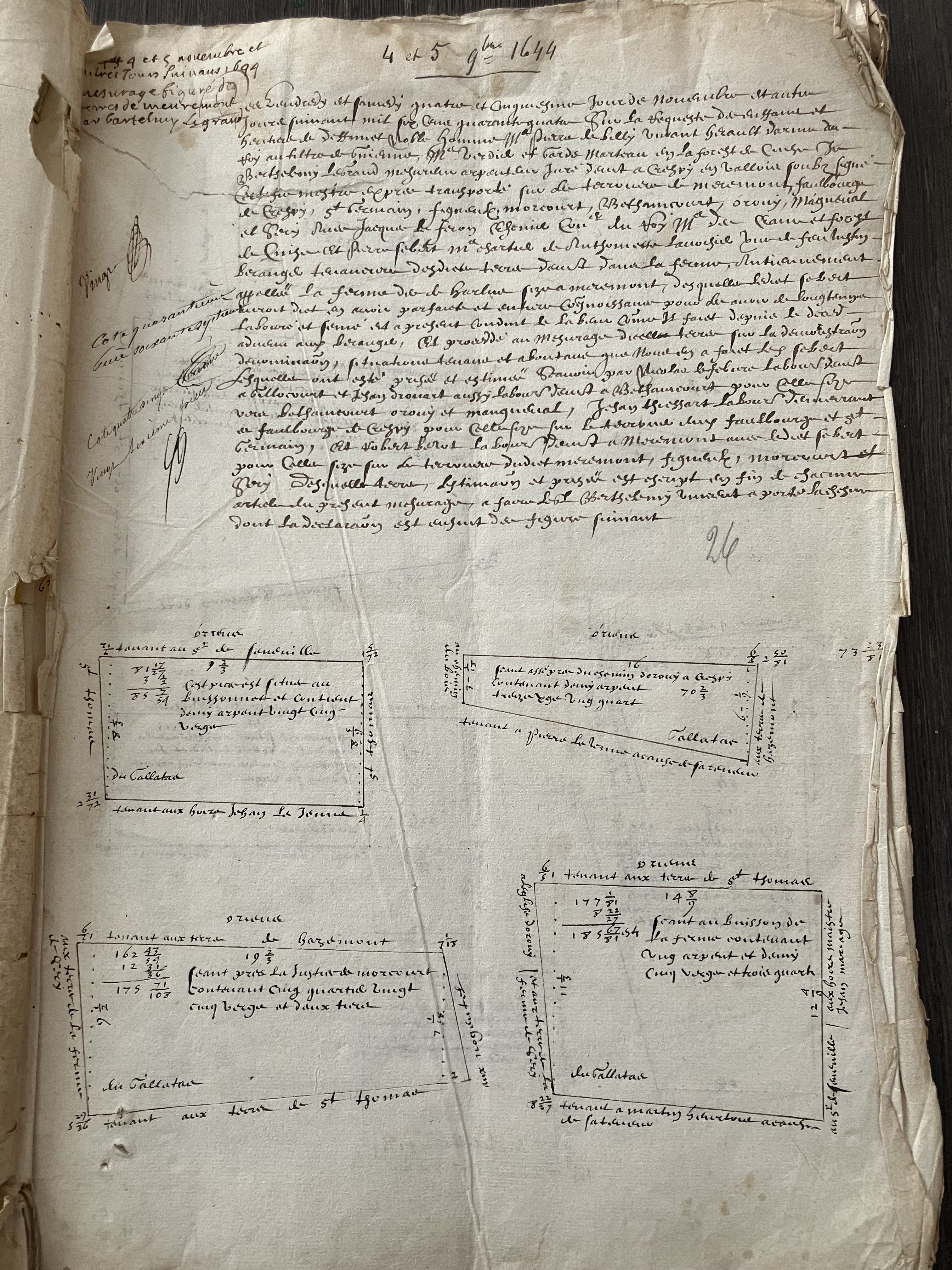 - le mesurage de la ferme, daté de 1644, comprenant la description et un plan de chacune des parcelles. Ce mesurage a été effectué pour permettre le partage de 1646 mentionné ci-après.