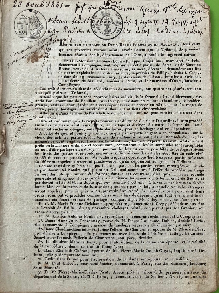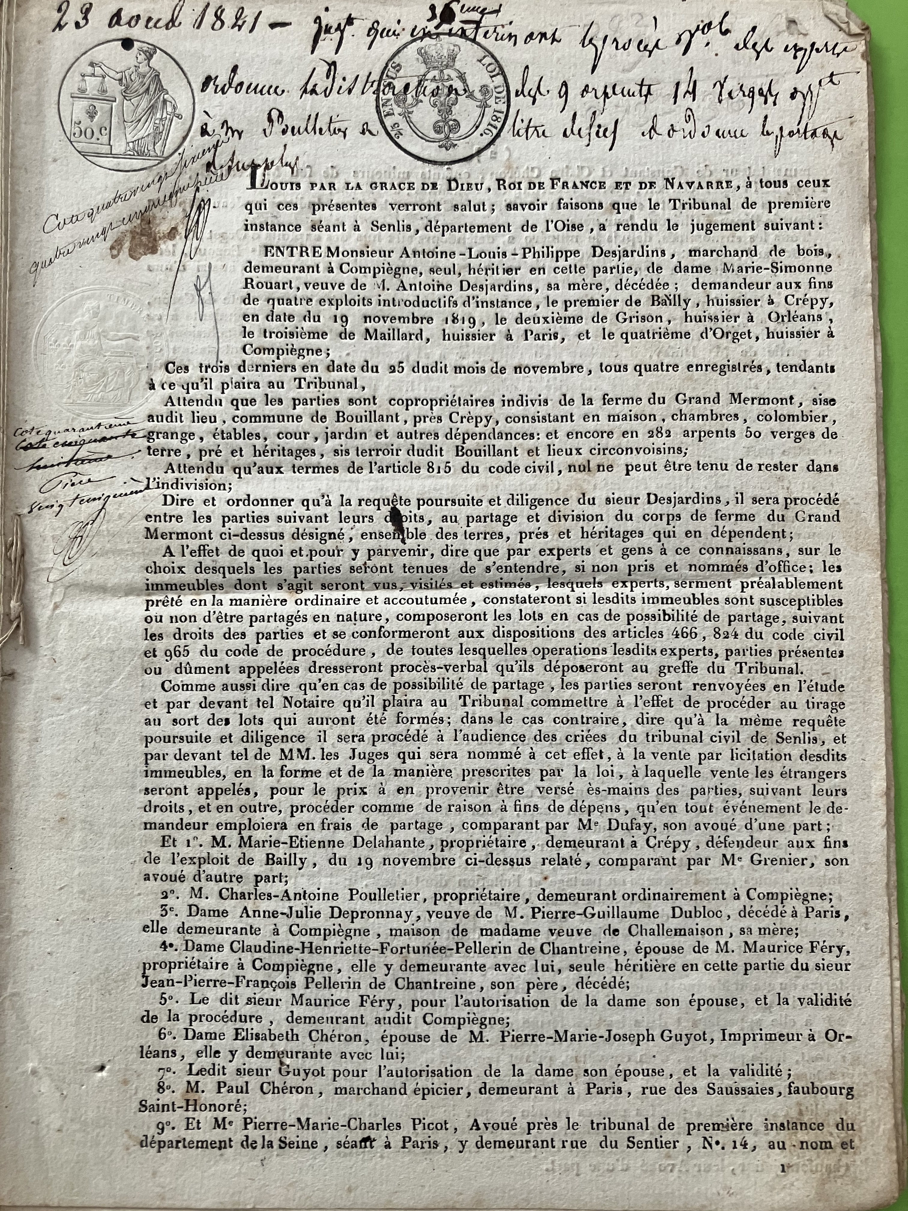 25/07/1822 [Jugement du tribunal civil de première instance de Senlis concernant la ferme de Mermont] Jugement qui entérine le rapport du 15 décembre 1821 et ordonne 1/ que les 9 pièces de terre qui étaient autrefois en fief, abandonnées par le partage de 1626 aux enfants de Gilles Charmoluë au titre du droit d’ainesse, appartiendront à Poulletier, qui représente les enfants de Gilles Charmolue 2/ que les trois lots composé par les experts seont tirés au sort pour être attribués à Poulletier, aux représentants de Charlotte Charmolue veuve de Daniel Boucher, et aux représentants de Léon Charmolue 3/ qu’aussitôt le tirage au sort effectué, il sera procédé à la subdivision des deux lots en huits lots égaux (destinés aux représentants de Charlotte Charmolue) et en cent quarante quatre lots égaux (destinés aux représentants de Léon Charmolue). Copie du jugement adressée à Charles-Antoine Poulletier.