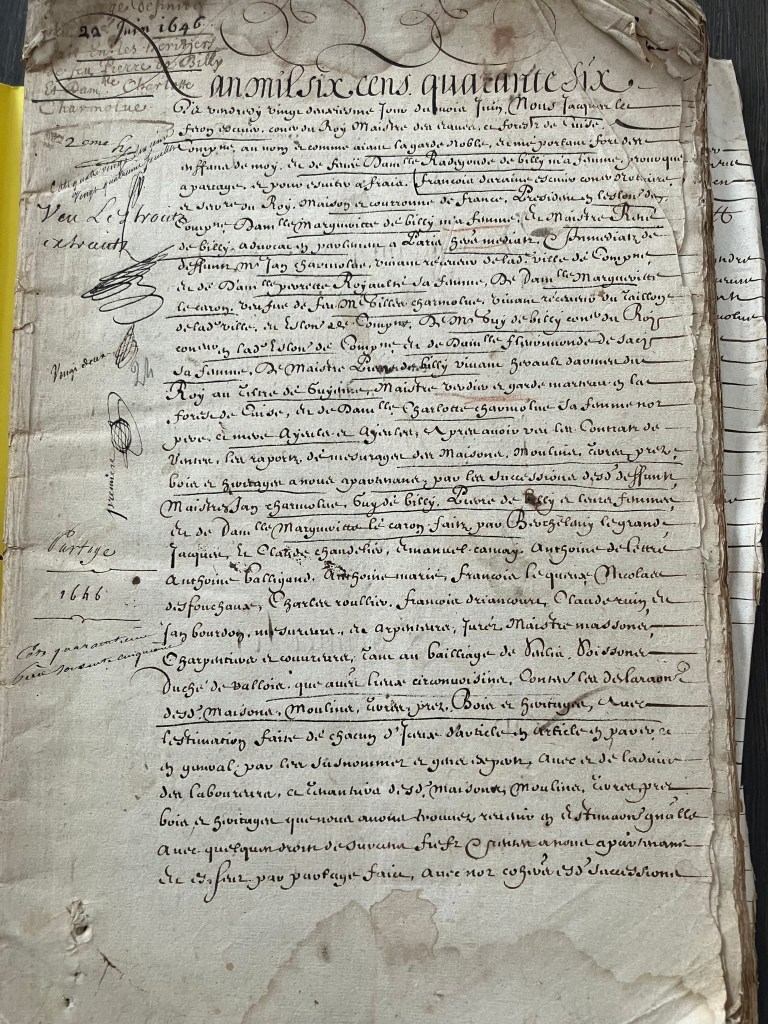 22/06/1646 [Partage entre les héritiers de Pierre de Billy et Charlotte Charmolüe, original signé par les parties] Partage entre 1/ Jacques le Féron, écuyer, conseiller du roi, maître des eaux et forêts de Cuise Compiègne, au nom et comme ayant la garde noble et se portant fort des enfants de lui et de feue damoiselle Radegonde de Billy 2/ François Daraine écuyer, conseiller et notaire secrétaire du roi maison et couronne de France, président en l’élection de Compiègne, et damoiselle Marguerite de Billy 3/ Maître René de Billy, avocat en Parlement à Paris, héritiers médiats et immédiats de défunt maître Jean Charmolue, vivant receveur de la ville de Compiègne, et de damoiselle Perette Royalté sa femme, de damoiselle Marguerite le Caron, veuve de feu maître Gilles Charmolüe, vivant receveur du taillon de la ville et élu de Compiègne, de maître Guy de Billy, conseiller du roi, conseiller en l’élection de Compiègne, et de damoiselle Florimonde de Sacy sa femme, de maître Pierre de Billy, vivant héraut d’armes du roi au titre de Guyenne, maître verdier et garde marteau en la forêt de Cuise, et de damoiselle Charlotte Charmolue sa femme, père et mère, aïeux et aïeules des comparants. Le partage fait suite à divers mesurages effectué par Barthélémy Legrand, Jacques et Claude Chandelier, Emmanuel Camay, Antoine Delettre, Antoine Balligand, Antoine Marie, François Lequeux, Nicolas Desfouchaux, Charles Roullier, François Driancourt, Claude Ruin, et Jean Bourdon, mesureurs et arpenteurs jurés, maître maçons, charpentiers et couvreurs, tant au bailliage de Senlis, Soissons et duché de Valois.