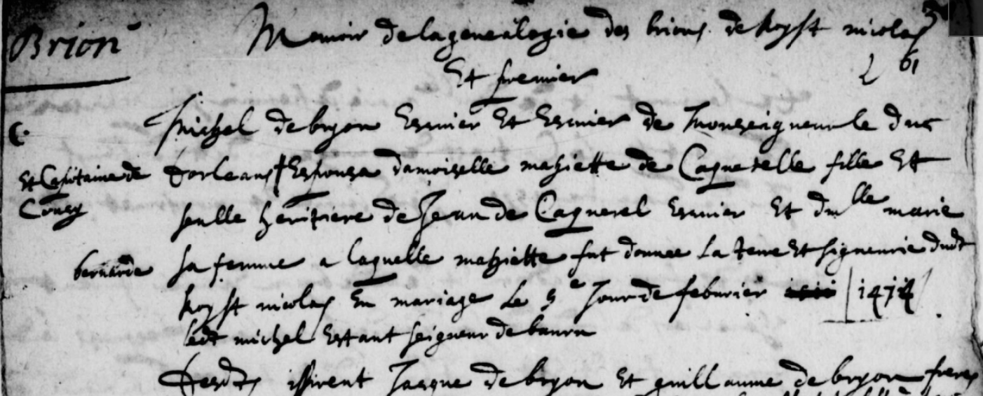 Mahiette Cacquerel, épousa Michel Brion, écuyer du duc d’Orléans, capitaine de Coucy, par contrat du 5 février 1474. Fille unique de Jean Cacquerel et Marie Bernarde, elle reçut le fief de Roy-Saint-Nicolas lors de son mariage; comme il est indiqué dans le mémoire généalogique conservé au Cabinet des Titres de la BNF, dans le dossier « Brion » du Cabinet d’Hozier.
