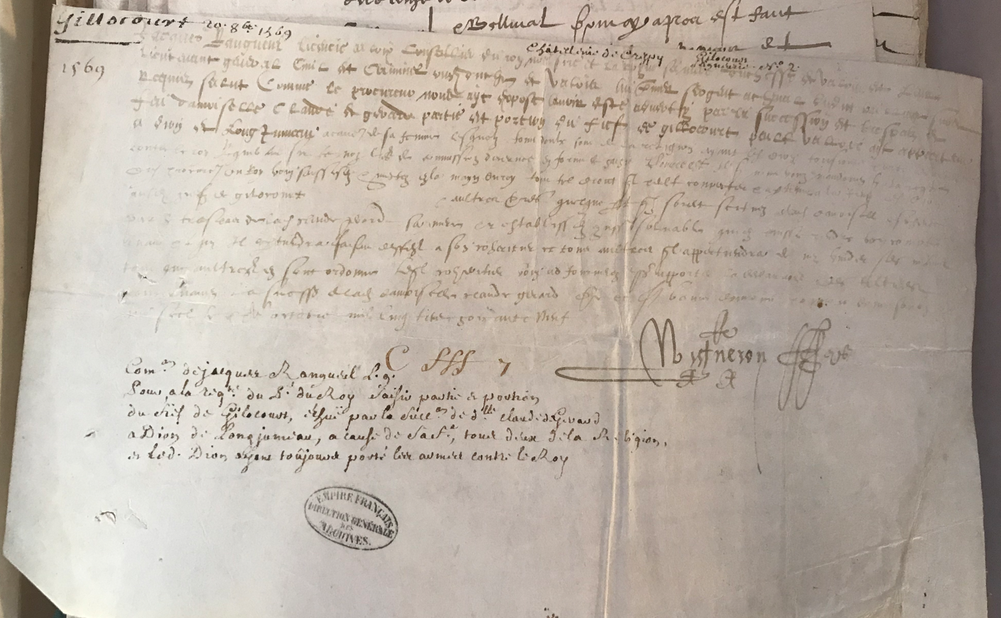 Commission de Jacques Rangueuil, lieutenant général du bailliage de Valois, pour faire saisir à la requête du procureur du roi une portion du fief de Gilocourt, échu à Dion de Longjumeau (Michel Gaillard) à cause de sa femme, tous deux de la religion, et ledit Dion ayant toujours porté les armes contre le roi. Arch. Nat. R/4/97, liasse Gilocourt