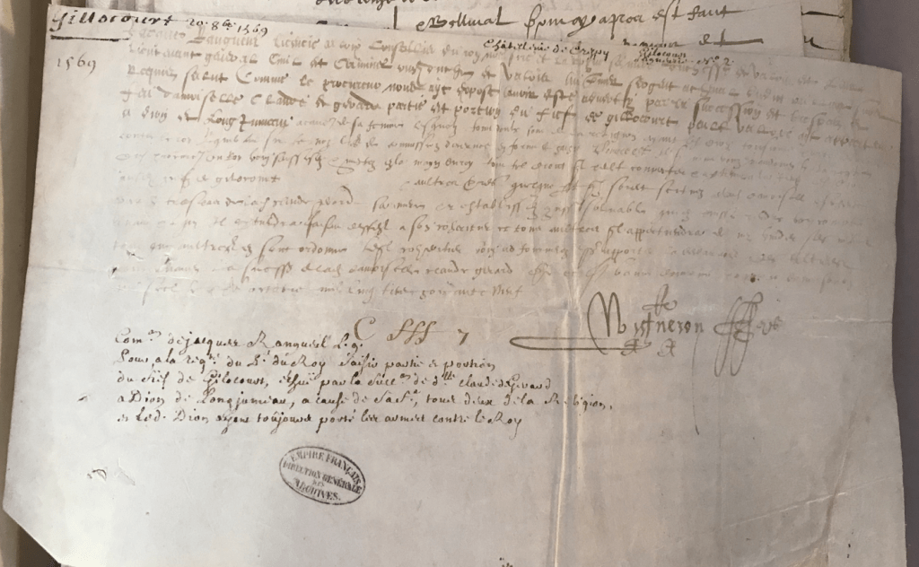 Puisqu’il existe un marqueur de protestantisme dans le choix des prénoms, on ne peut que s’arrêter sur un acte notarié conservé dans le minutier de Coeuvres. Le 31 décembre 1597, l’écuyer Jean de Fillion et sa femme Anne du Paiage réalisent une vente au profit de Paul de Calois (4). Ce dernier appartient à la parentèle de la famille Cacquerel, déjà évoquée : il a épousé une certaine Françoise de Cacquerel. Mais surtout, il est le tuteur et curateur de son neveu Daniel de Calois, dont les sœurs se nomment Rachel, Suzanne et Hélène.