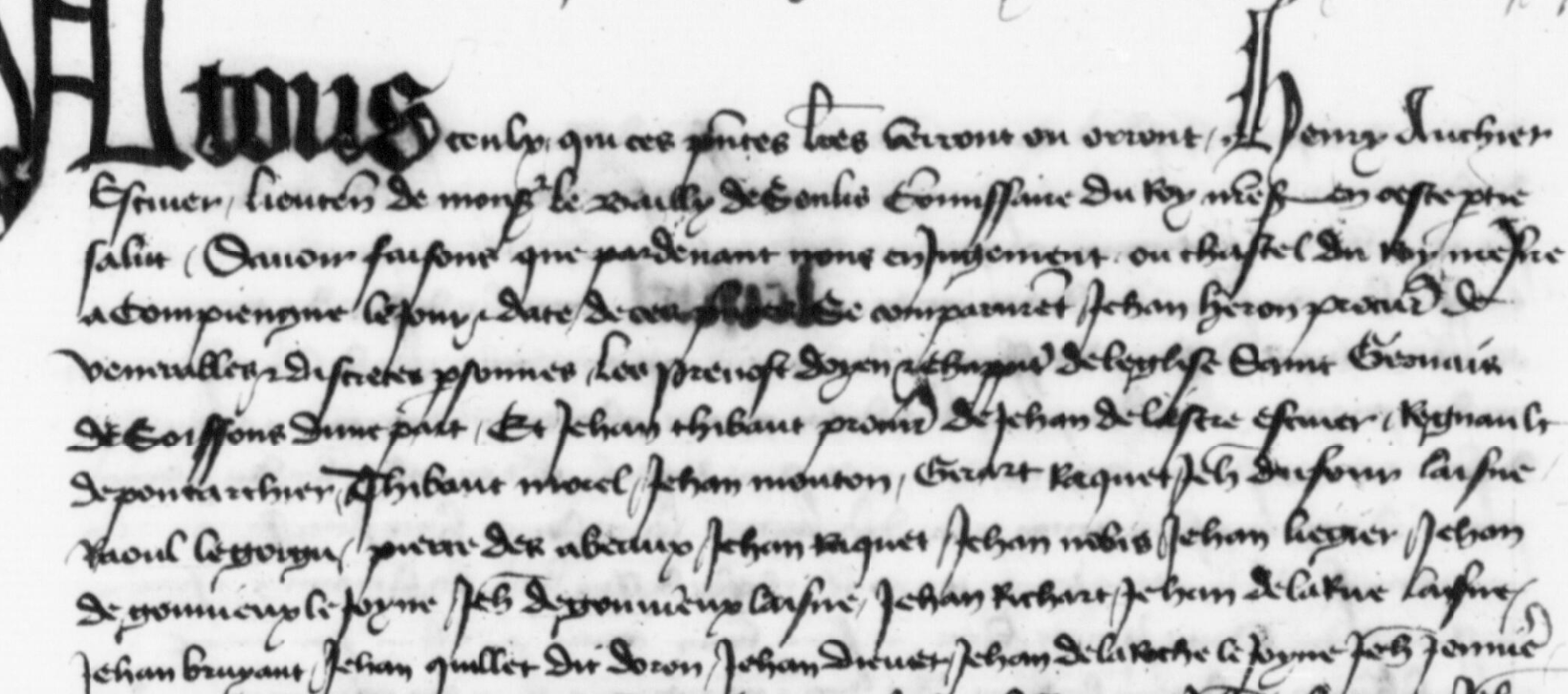 (7407) 02.11.1674 Nicolas CAUCHEME le jeune, laboureur à Hautefontaine, Pierre CAUCHEME, laboureur à Jaulzy, Antoine LOURSON, laboureur à Montigny et Marie CAUCHEME sa femme, enfants de défunts Jean CAUCHEME et Marie BAILLET, héritiers de Nicolas SERVA, fils d’Antoinette BAILLET, vivante femme de Charles SERVA.